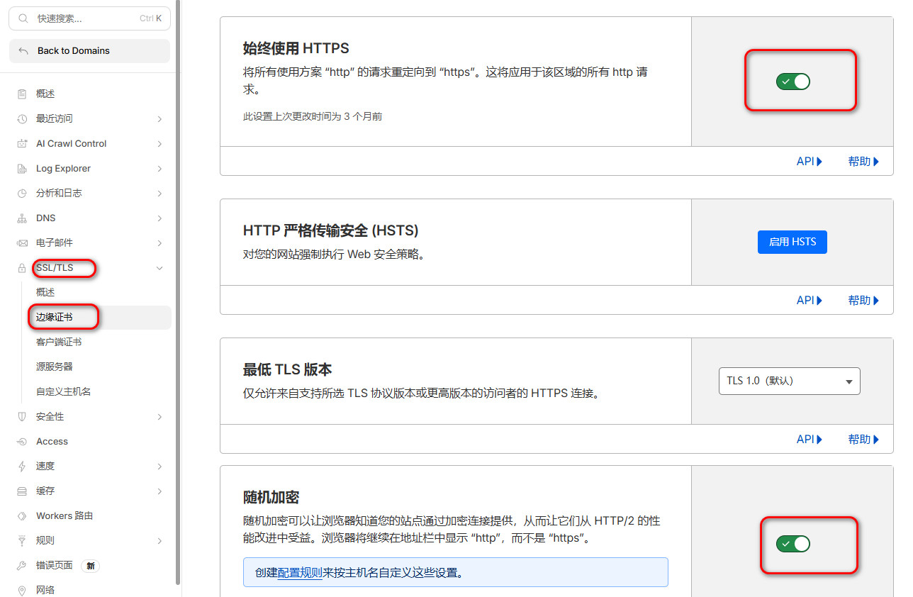 回到cloudflare页面,点开你的域名,左侧选择SSL/TLS-边缘证书,打开下图两项:“始终使用HTTPS”和“自动 HTTPS 重写”,到这里Cloudfalre的设置就全部完成了。