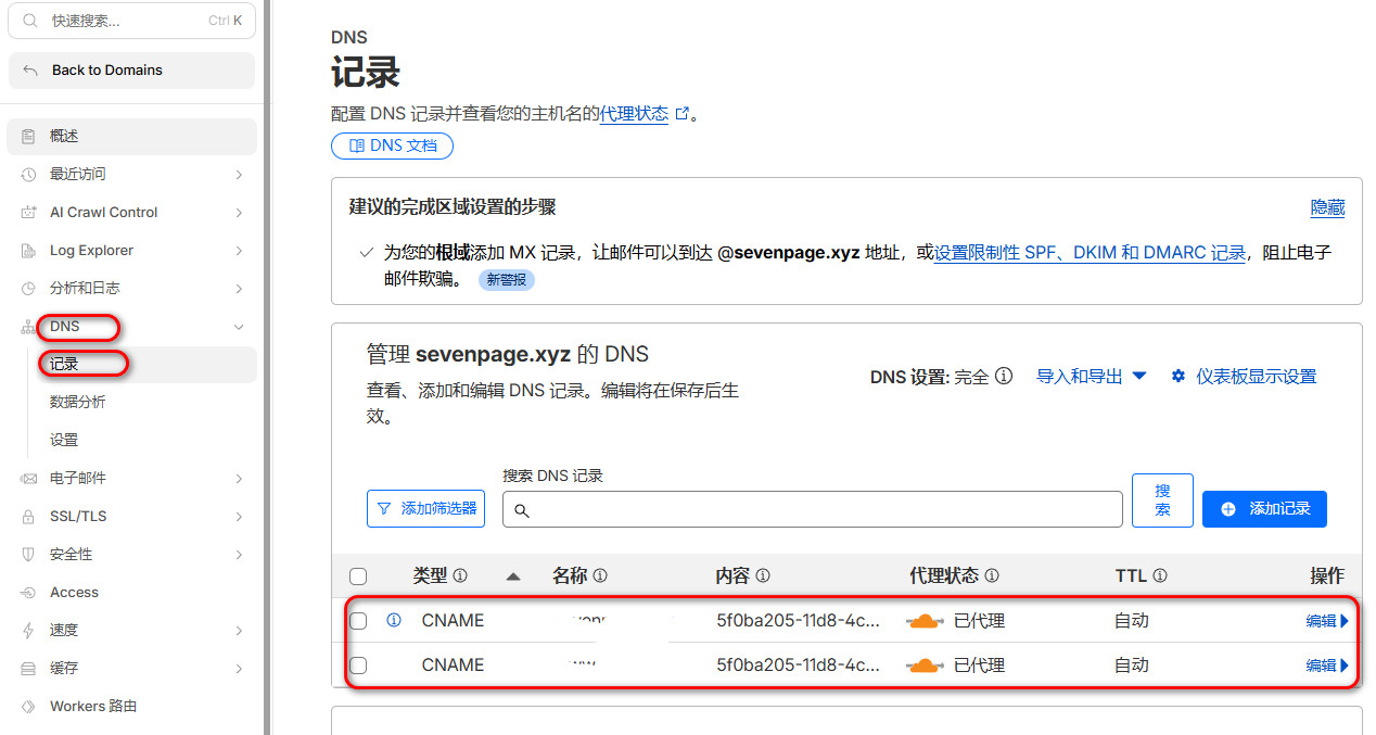 设置并保存后为(下方一图),这里参考图是因为我添加了两个二级域名所以有两行,相应的回到域名的DNS记录页面(下方二图),会看到已经自动添加了两个CNAME记录,并且开启了代理,这里什么都不要动。