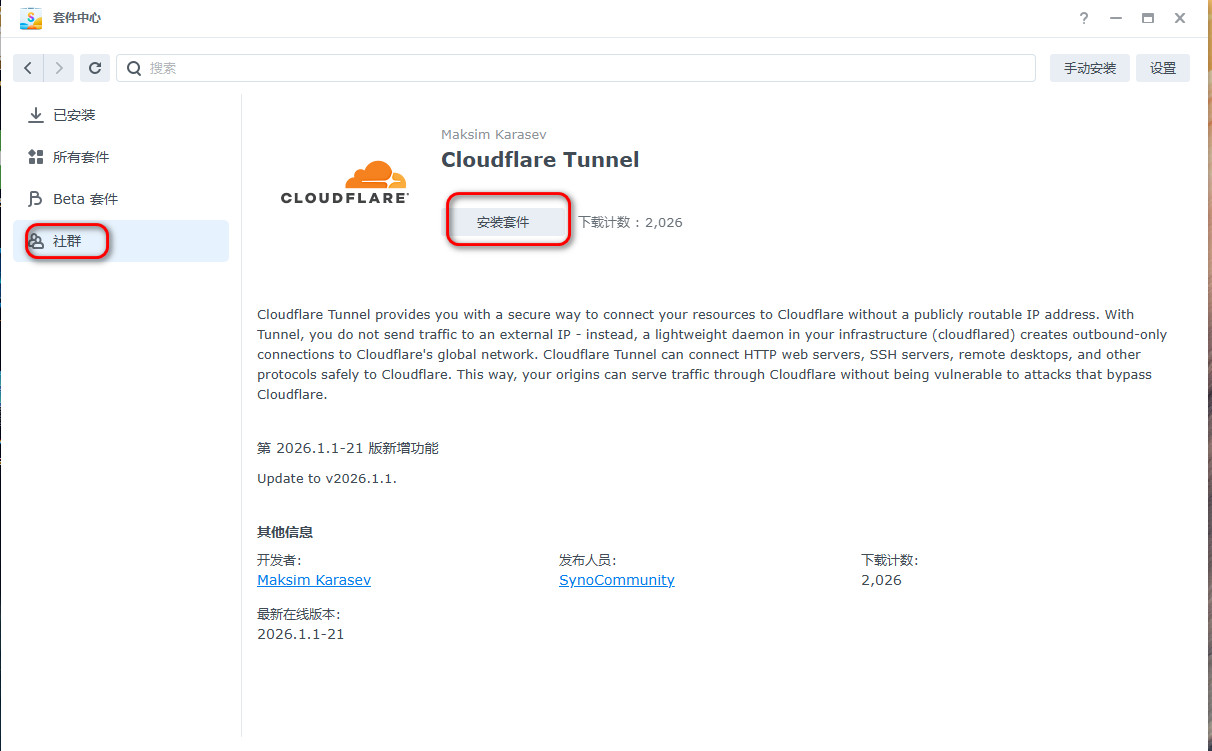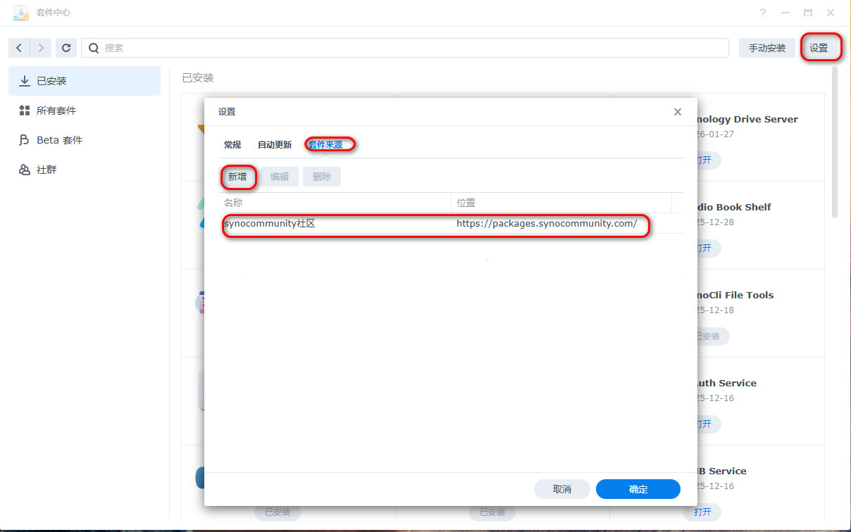 我使用的是群晖NAS,这里我选择了一个第三方的套件,可视化安装相对简单。首先要给群晖套件中心添加一个套件来源。地址:https://packages.synocommunity.com
