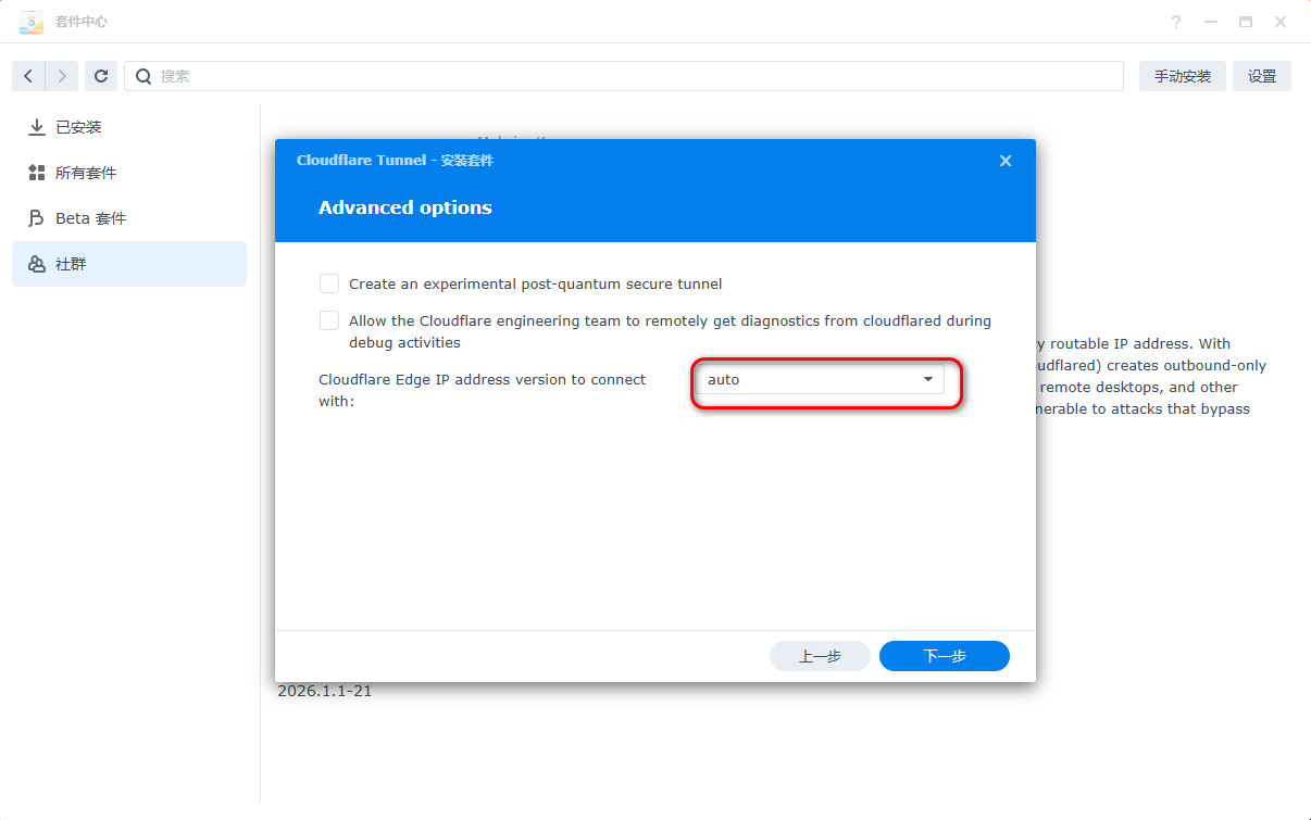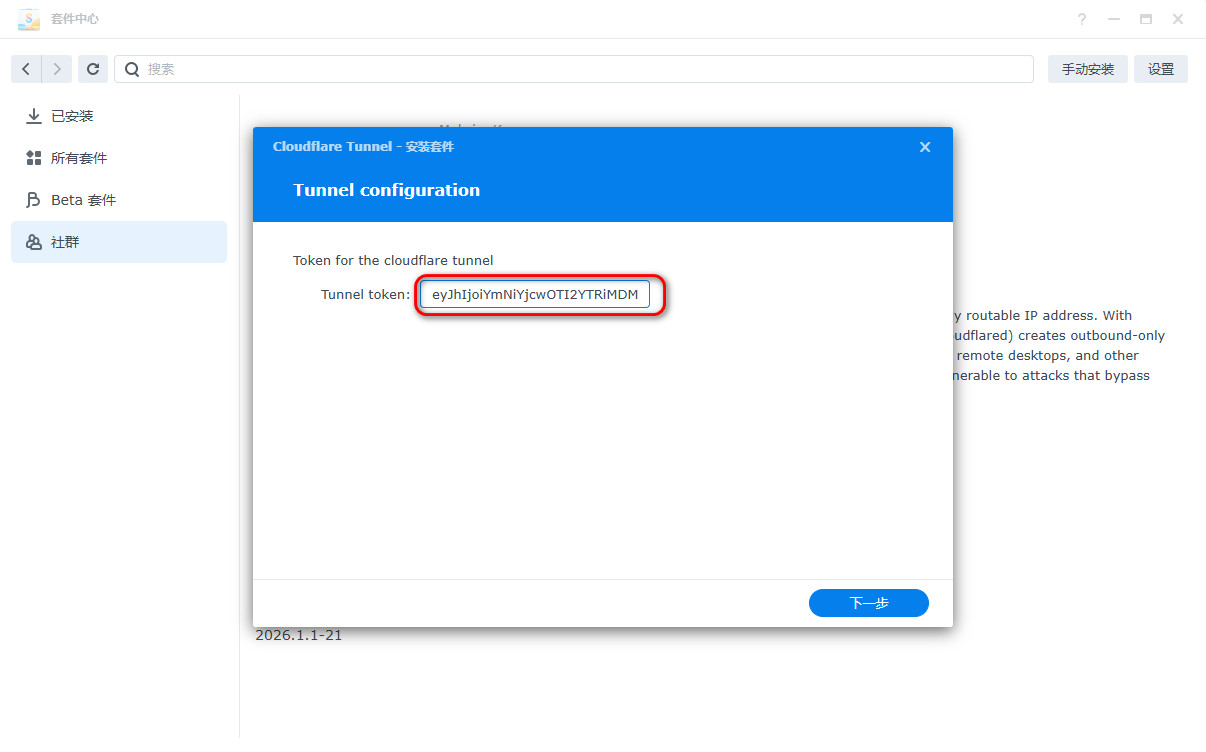 将复制的令牌粘贴到群晖安装Cloudflared Tunnel套件弹出的以下界面。
