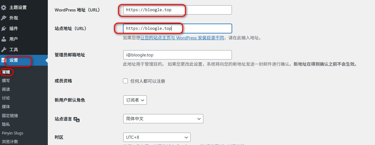 注意:此处如果你同我一样是要访问内网的WordPress博客,需要提前在WordPress的设置内修改“WordPress地址”和“站点地址”为要使用的域名(参考下图),因为WordPress有访问限制,修改后内网可能无法访问,如需再次修改WordPress后台又无法进入,可直接访问数据库修改相应条目,别问我怎么知道的。